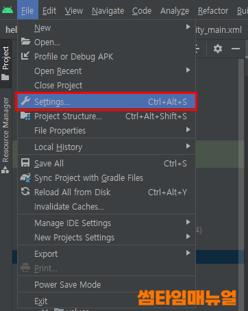 좌측 상단의 File -> Settings... (Ctrl + Alt + S) 선택