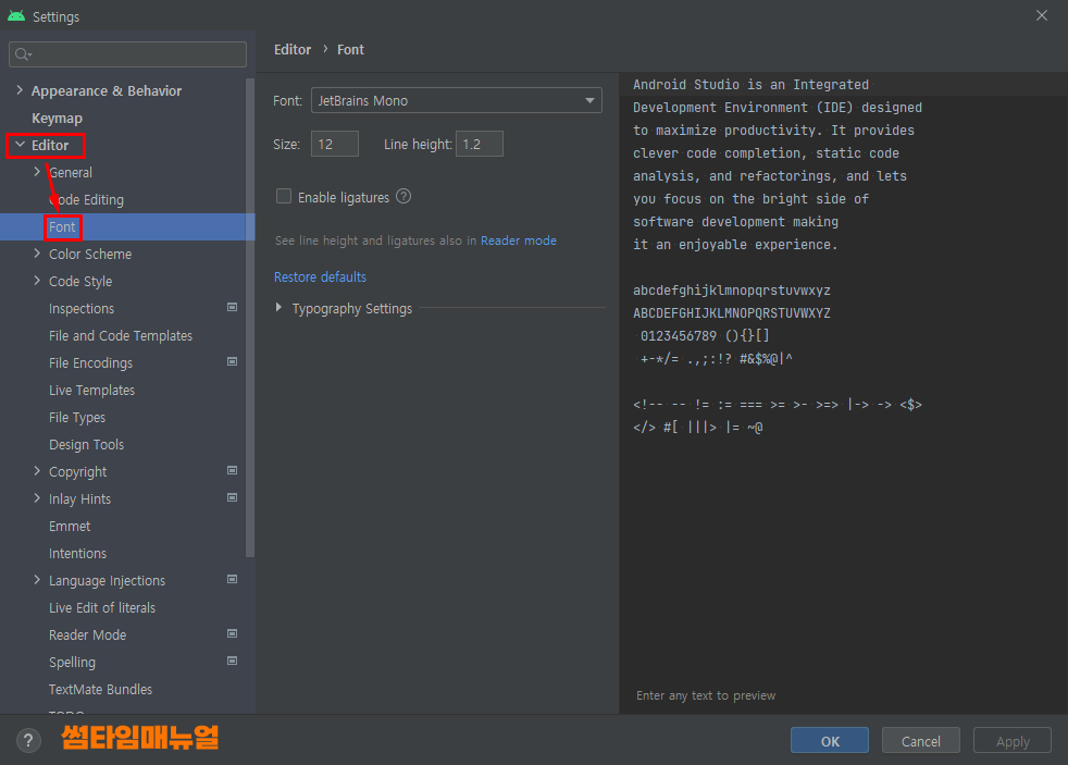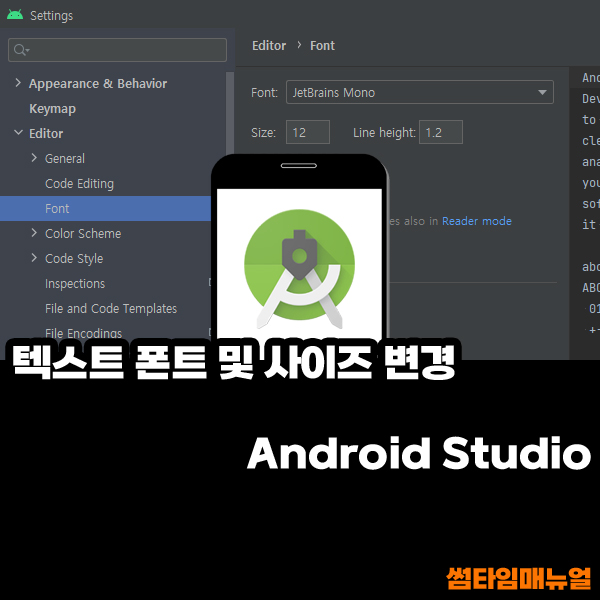 안드로이드 스튜디오에서는 작성한 소스 코드를 보다 더 잘 보일 수 있도록 글자 크기나 폰트를 지정할 수 있습니다 화면에 보이는 소스코드의 텍스트가 너무 작거나 크다면 손쉽게 설정 항목으로 이동하여 사용자 환경에 맞게 조정이 가능합니다