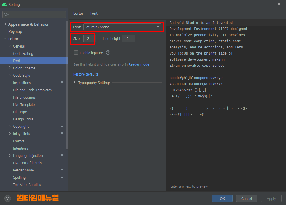 Font 항목과 Size 항목을 각각 설정해준다면 값이 적용됩니다