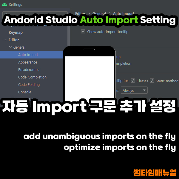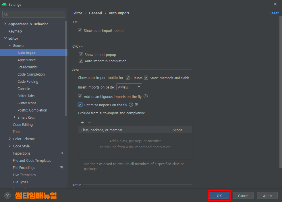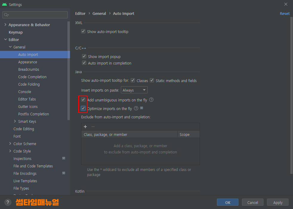 Editor -> General -> Auto Import 선택 한 뒤 각각의 설정을 체크하여 줍니다