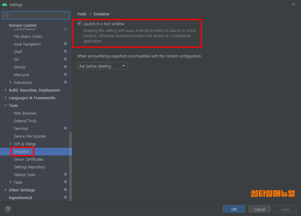 기본값은 위와같이 별도의 에뮬레이터 창이 아닌 안드로이드 스튜디오 내 에뮬레이터가 확인되며 별도 윈도우에서의 실행 시 설정값을 해제하여 주도록 합니다