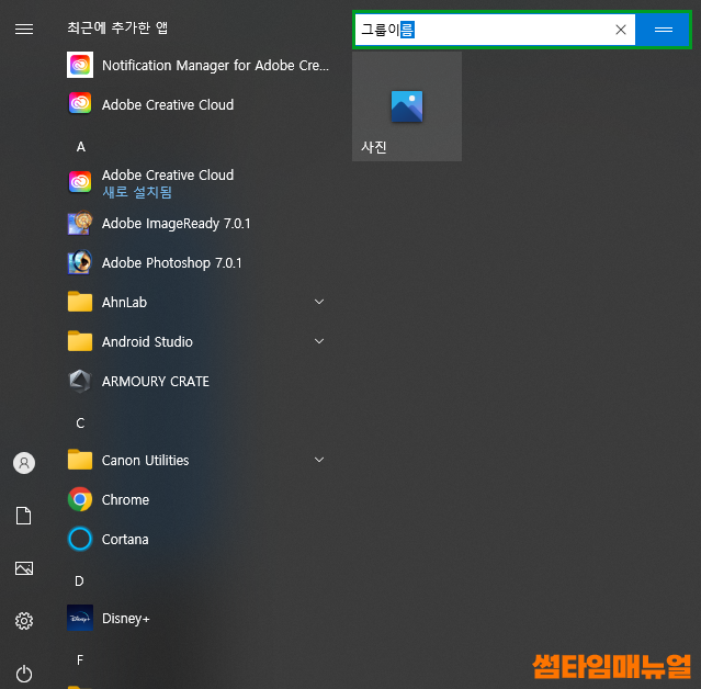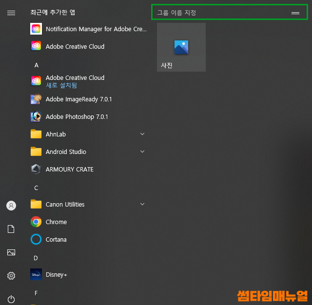 라이브타일의 바로가기 상단부분에 마우스를 올리면 위와같이 메뉴바가 확인되는데 메뉴바를 클릭하여 그룹 이름을 지정할 수 있습니다
