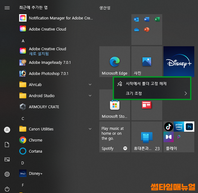 라이브타일에 등록되어있는 항목에 우클릭 버튼을 누르는 경우 위와같이 고정해제 항목이 보이게 되며 "시작에서 폴더 고정 해제" 버튼을 클릭한다면 손쉽게 항목을 제거해낼 수 있습니다