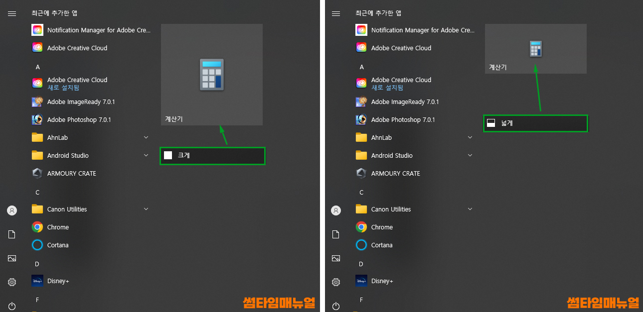 라이브타일에 추가하였다면 사이즈또한 조정할 수 있는데 우클릭 버튼을 눌러 "크기 조정" 항목에서 사이즈를 선택합니다