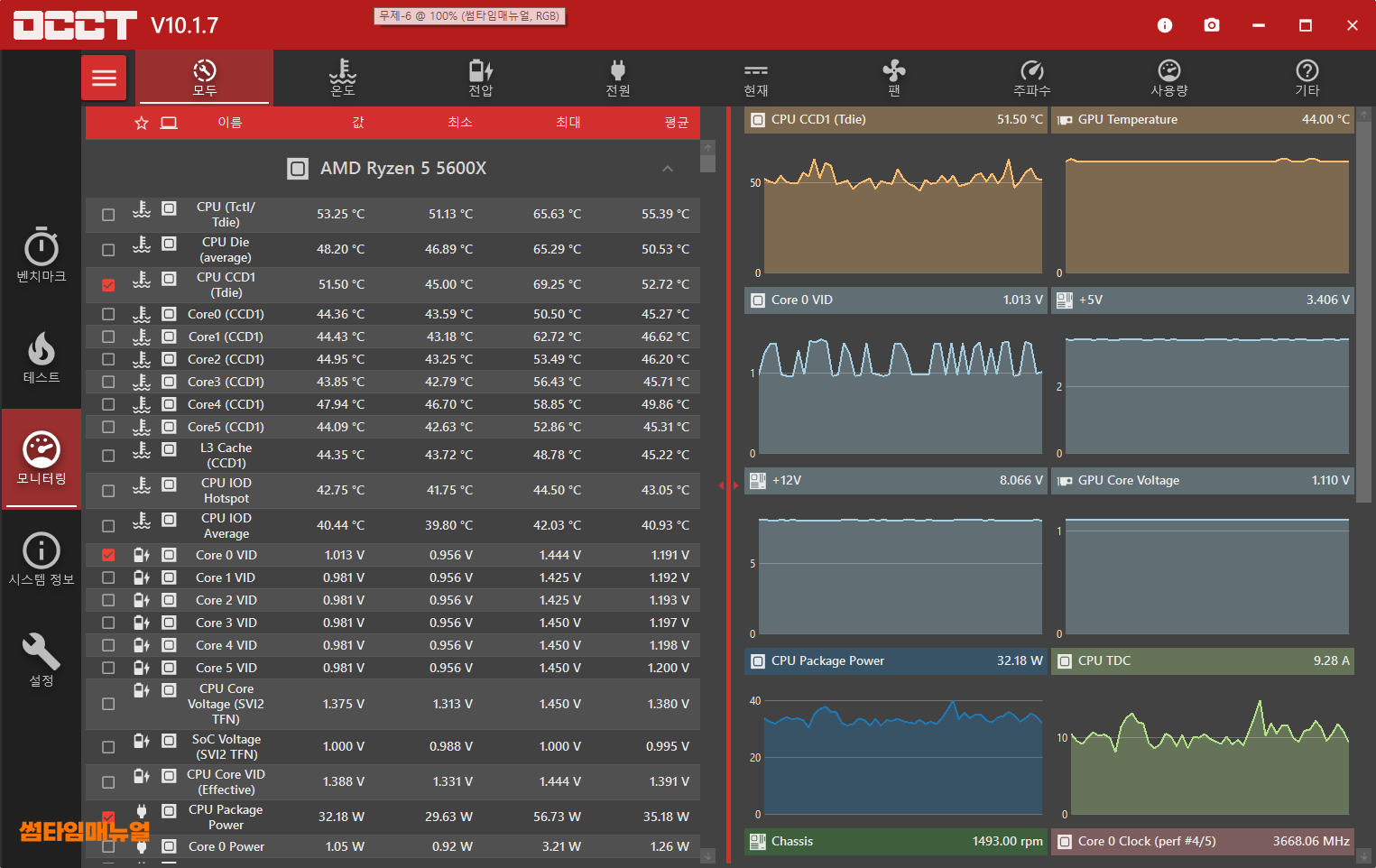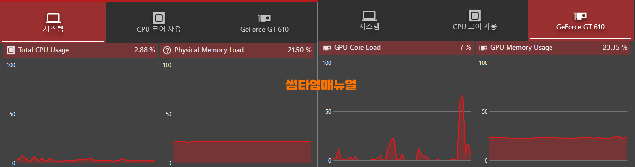 좌측 상단부분에서 보면 현재 CPU의 사용량과, GPU(그래픽카드)의 사용량이 그래프로써 확인되며 현재의 상태에 대해 한눈에 확인이 가능합니다