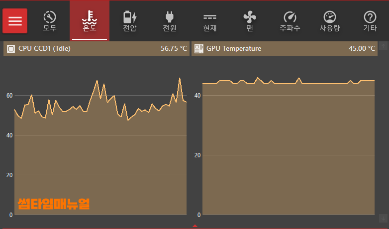 우측 상단에서는 온도와, 전압 팬동작속도 등 여러가지의 정보를 확인할 수 있는데 주로 체크하여야 하는 항목은 "온도" 항목으로 현재 의 CPU또는 GPU 온도가 아무 작업하지 않은 경우 65도를 넘어가는 수준이라면 꾀나 뜨거운 수준으로 쿨링 팬들이 정상적으로 동작하는지, 너무 낮은 풍압을 사용하여 동작되고있는것은 아닌지 그리고 서멀구리스 도포가 오래되지는 않았는지 체크 해보시는것이 좋겠습니다