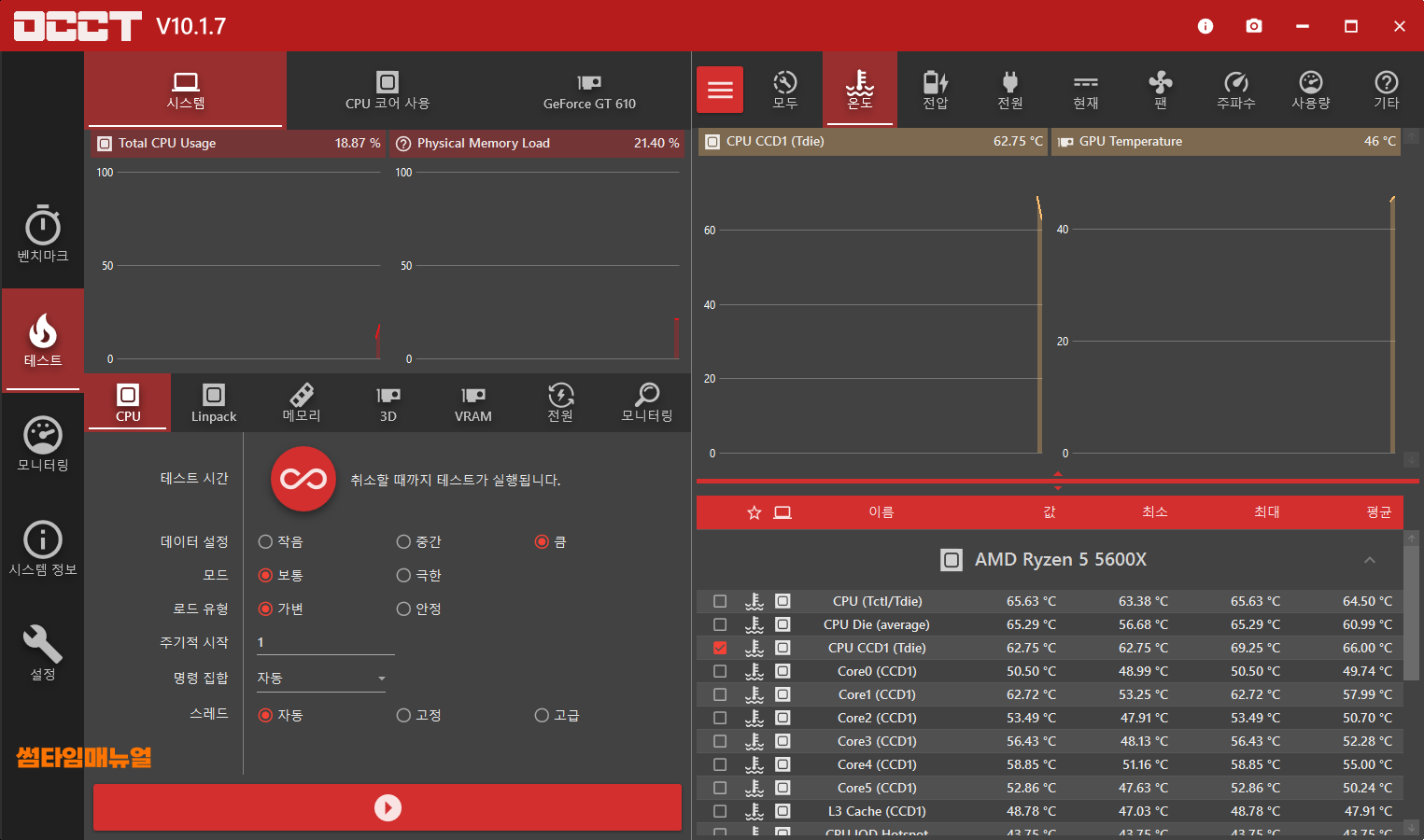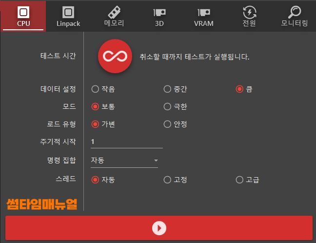 프로그램을 실행한다면 위와같이 화면이 확인되며 시스템정보와, 현재의 상태 그리고, 테스트할 항목들에 대해 확인이 가능합니다