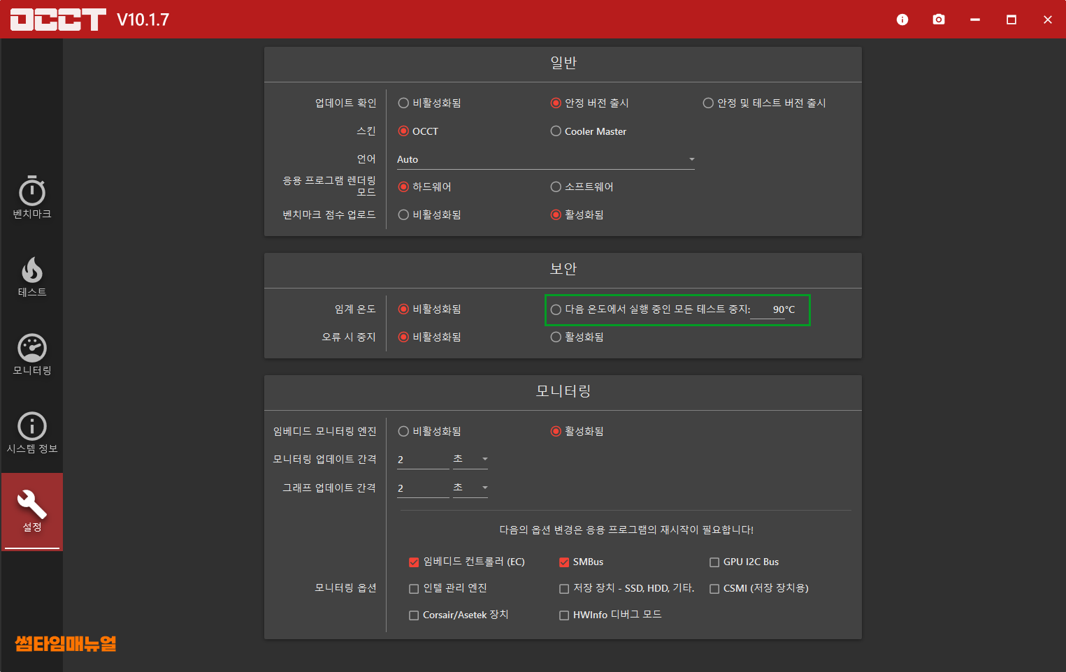 설정항목에서는 임계온도 값의 설정을 "95ºC" 정도로 설정해주도록 하며 해당설정이 설정되지않는 경우 시스템이 100도를 넘어선 경우 다운되게 됩니다