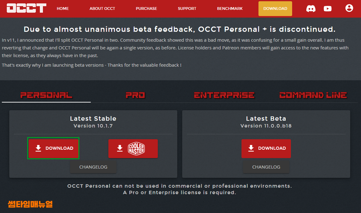 버전은 Personal, PRO, Enterprise, Command Line 버전으로 총 4가지로 구분되며 개인사용자에게 한하여 무료로 배포되고 있습니다 개인사용자 경우 Personal 탭에서 다운로드를 받아주도록 하며 좌측의 일반 Download 버튼을 클릭하여 다운받도록 합니다