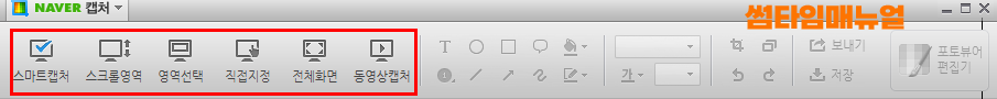 상단 항목에서 살펴본다면 스마트캡처, 스크롤영역 등의 다양한 기능을 지원하는데 단축키와 내용은 아래와 같습니다