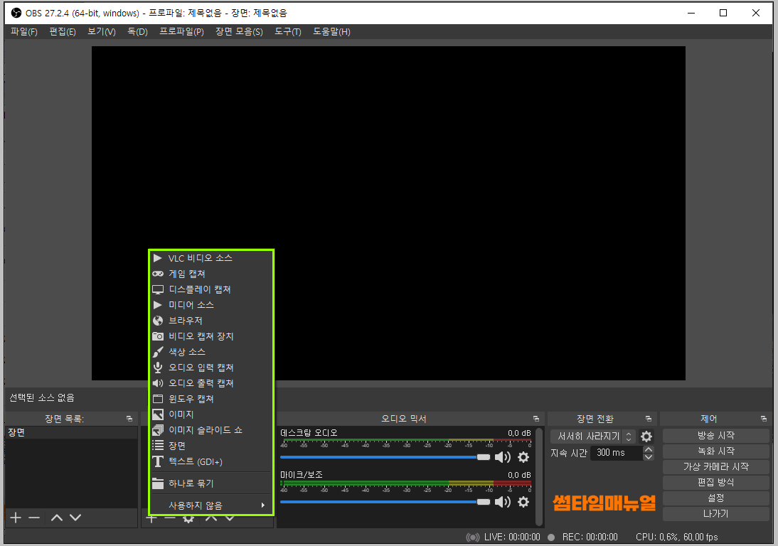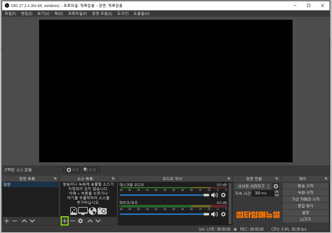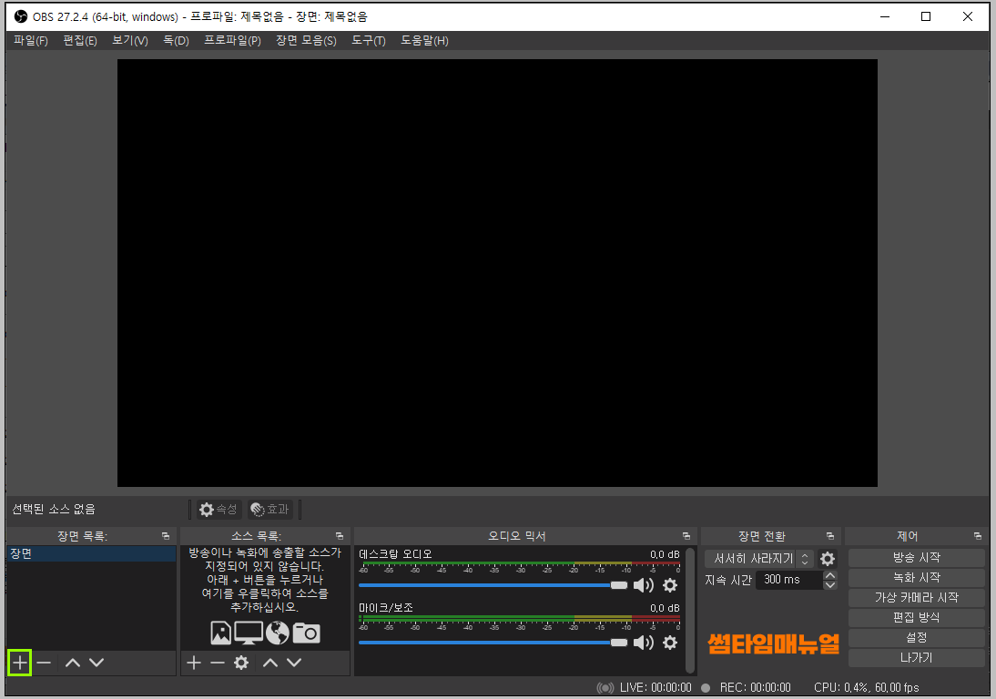 먼저 녹화설정을 위해 어떤 화면을 송출시킬것 인지에 대해 장면을 선택하여야 하며 기본값으로 장면 하나가 추가되어있고, 장면마다 녹화나 송출할 화면 설정값을 각각 저장할 수 있습니다