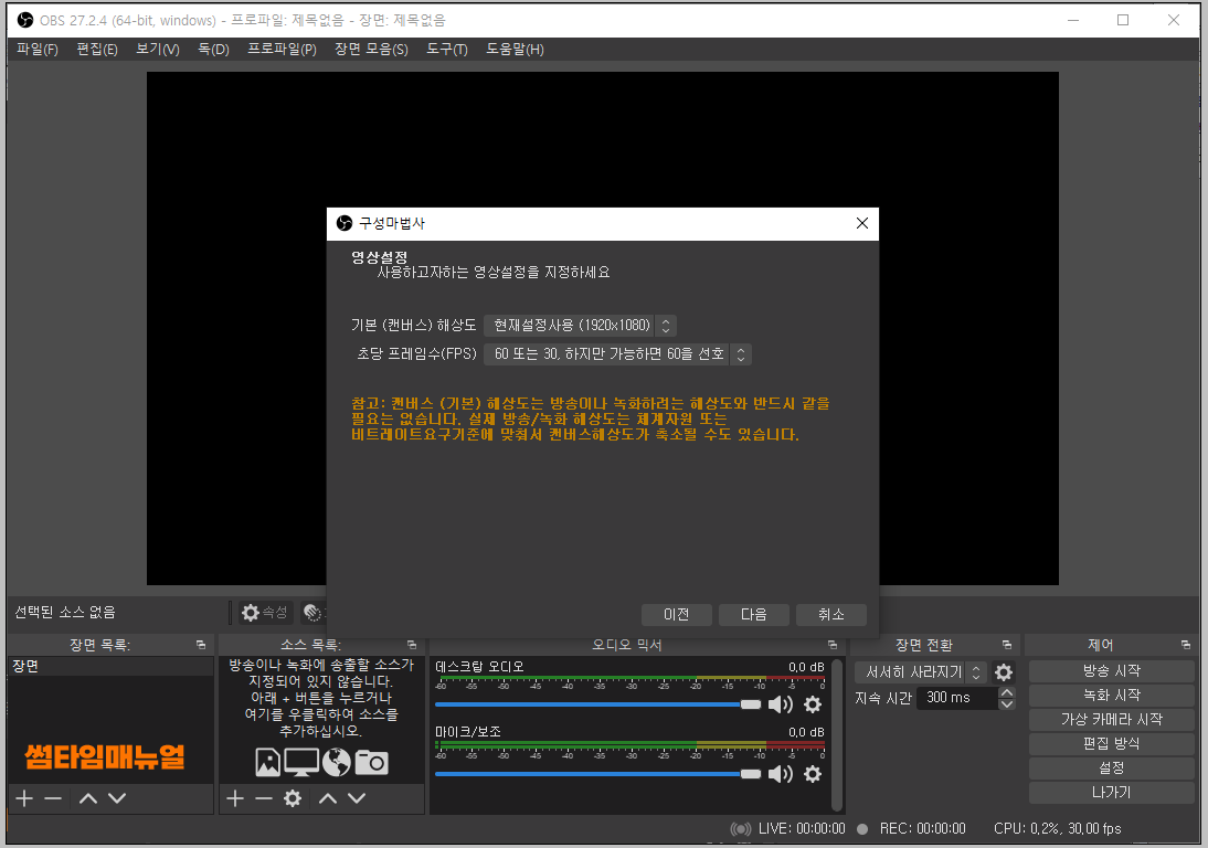 필자의 경우 "녹화최적화" 용도로 선택하였으며 다음으로 이동한 경우 위와같이 해상도와 프레임에 대한 설정을 진행하게 됩니다 일반적인경우 FHD(1920x1080) 에 60FPS 을 선택하시면 문제없는 영상 생성이 가능합니다