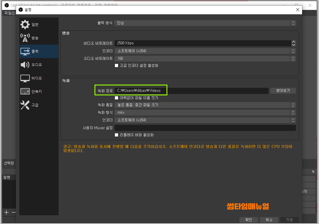 저장경로의 변경이 필요한 경우 좌측 상단의 "파일" -> "설정" 항목으로 이동하여 설정창의 "출력" 탭에서 녹화 경로의 설정이 가능합니다