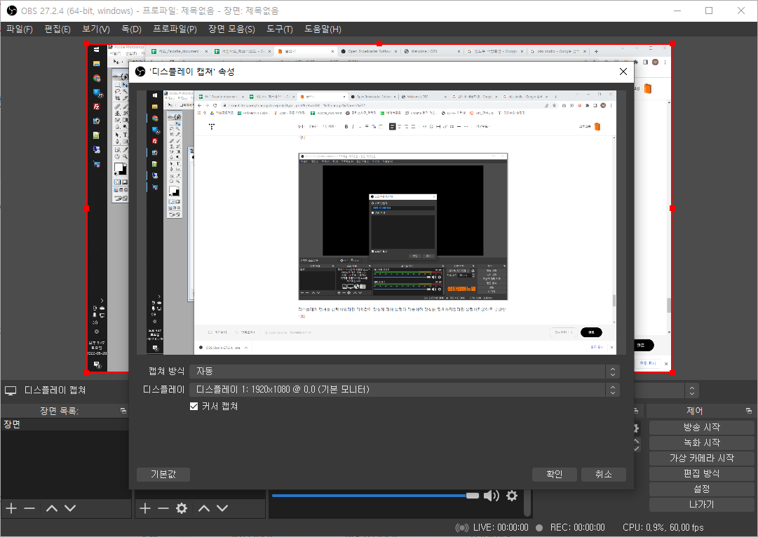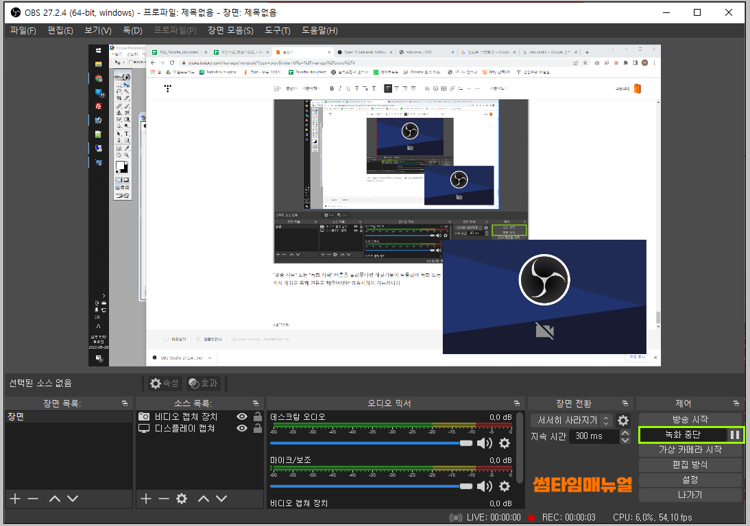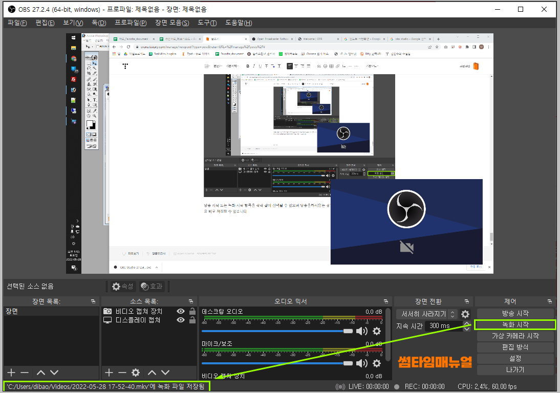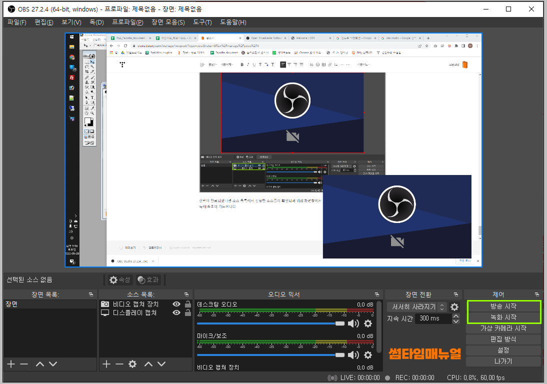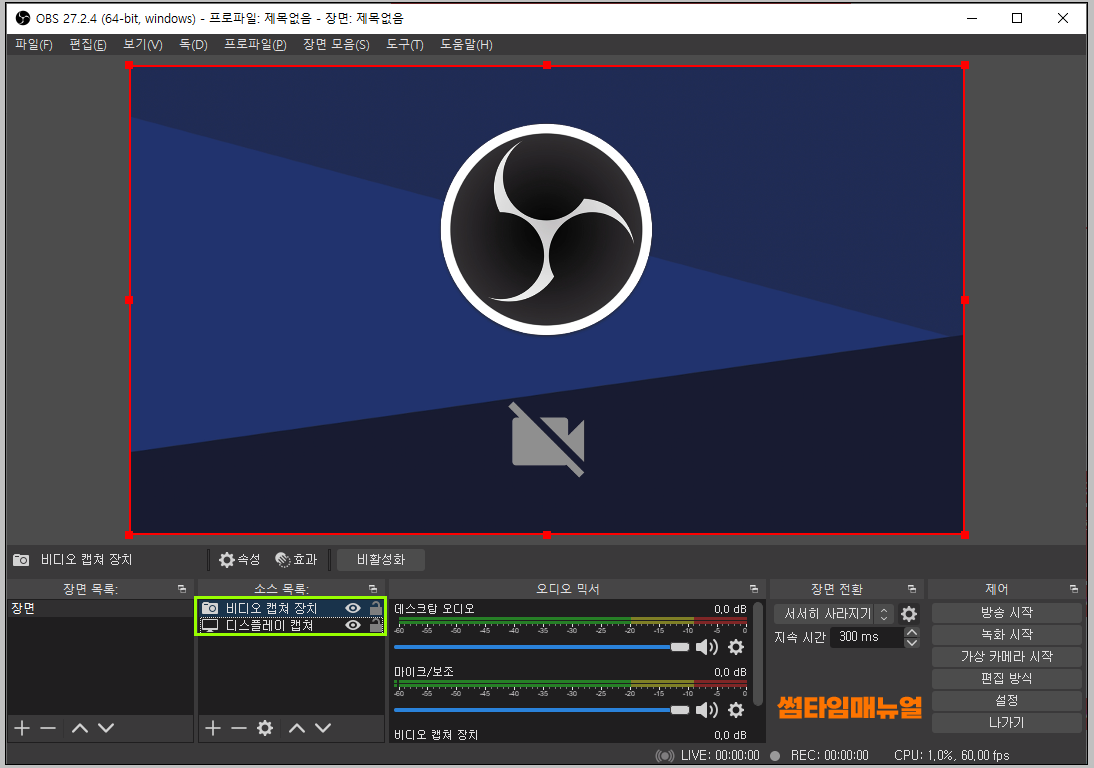 선택이 완료되었다면 소스 목록에서 설정한 소스들이 확인되며 위의 화면창에서 드래그 또는 화면의 사이즈를 조정하여 녹화/송출이 가능합니다