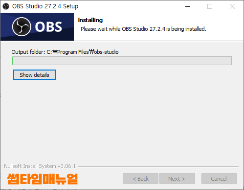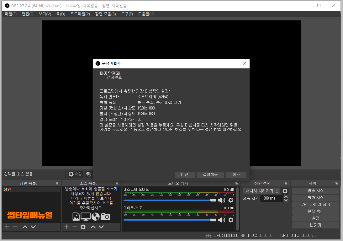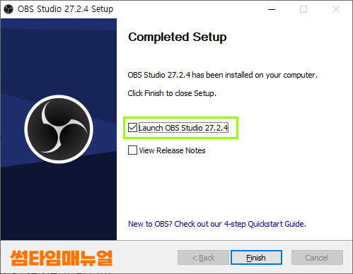 Launch OBS Studio 항목에 체크한 상태로 "Finish" 항목을 클릭해준다면 설치화면은 종료되고 프로그램이 바로 실행됩니다