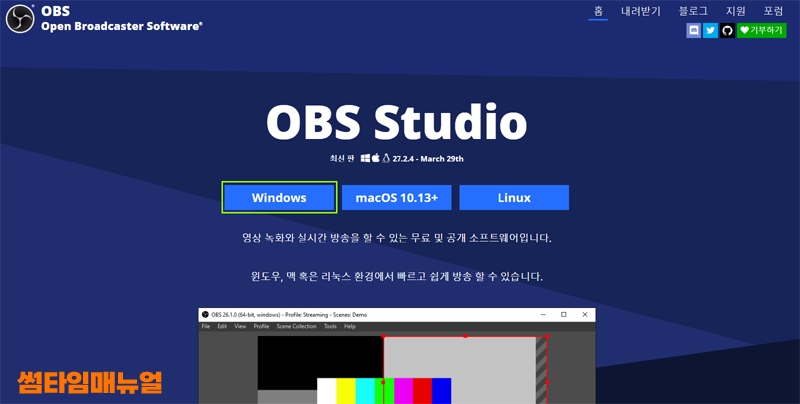 Open Broadcaster Soffware 의 약자로써 이름에서도 알 수 있듯 무료로 방송에 관련한 프로그램임을 알 수 있습니다 운영체제는 Windows, Mac OS, Linux 운영체제를 각각 지원하고 있으며 설치도 간편하게 공식홈페이지를 통해서 다운받을 수 있습니다