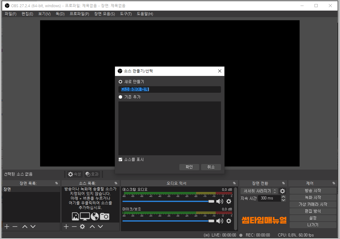 소스 목록 항목에서는 사진이나, 영상, 바탕화면, 게임화면 등의 화면을 선택할 수 있으며 +버튼을 눌러 원하는 화면을 선택할 수 있습니다