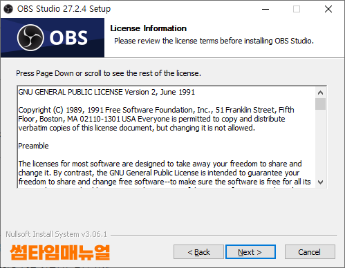 라이센스에 대한 정보가 확인되며 간단하게 설명하자면 모든 사용자는 사본을 복사하거나 배포할 수 있지만 프로그램에 대한 변경은 불가하다는 내용입니다 "Next >" 버튼을 눌러 다음으로 이동합니다