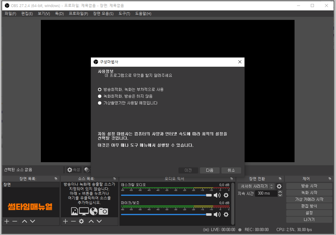 프로그램의 모습입니다 첫 화면으로는 해당프로그램의 사용용도에 대해 묻는창이 확인되며 방송송출용인지 또는 녹화용도로 사용할 것인지에 대해 선택할 수 있습니다 해당 항목을 통해 크게 변경되는것은 없으므로 크게 의미를 부여하지않고 용도를 선택하여 "다음" 버튼을 눌러주도록 합니다