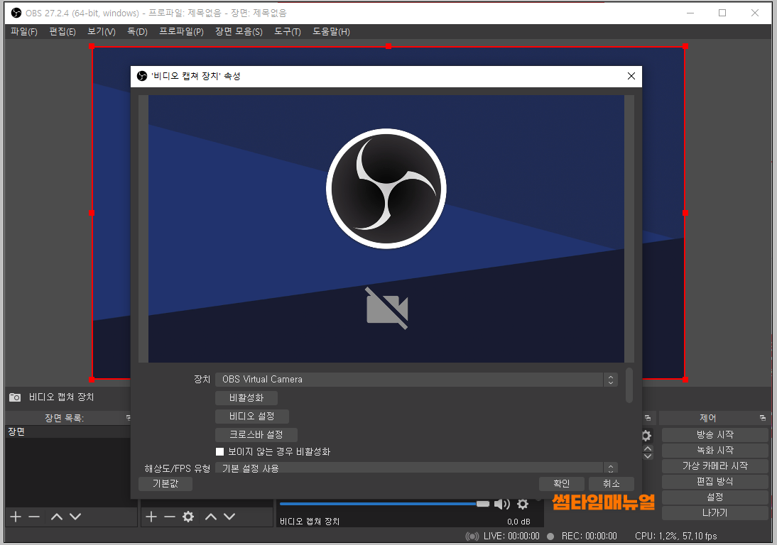 다음은 "비디오 캡쳐 장치" 항목으로 장치에 대한 설정을 진행해준다면 자신의 모습 또는 카메라에서 담겨지는 모습을 소스 지정할수 있습니다