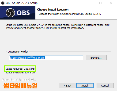 설치에 필요로 하는 저장장치의 공간은 353.5MB 로 크지않은 용량을 차지하며 여유공간이 있다면 "Install" 버튼을 클릭하여 설치를 진행합니다