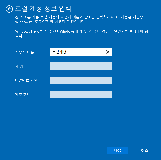 6. 로컬계정에 사용될 이름,암호 입력