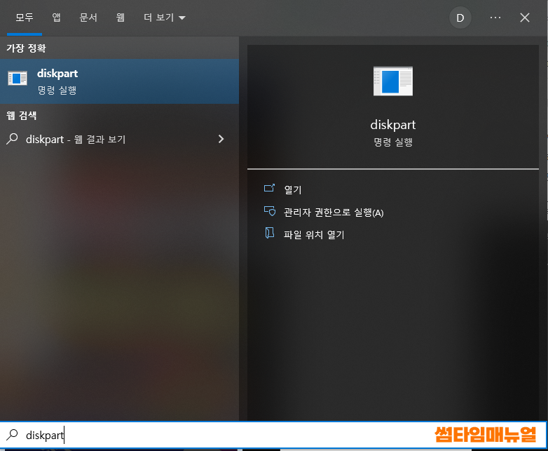키보드의 윈도우 버튼을 눌러 "diskpart" 검색시 위와같이 해당항목을 찾을 수 있습니다