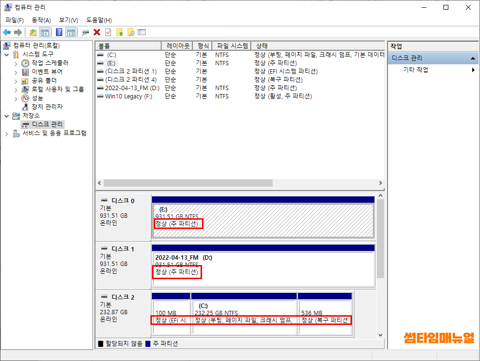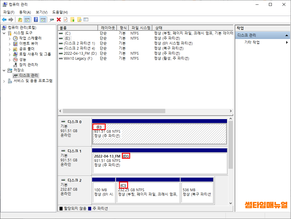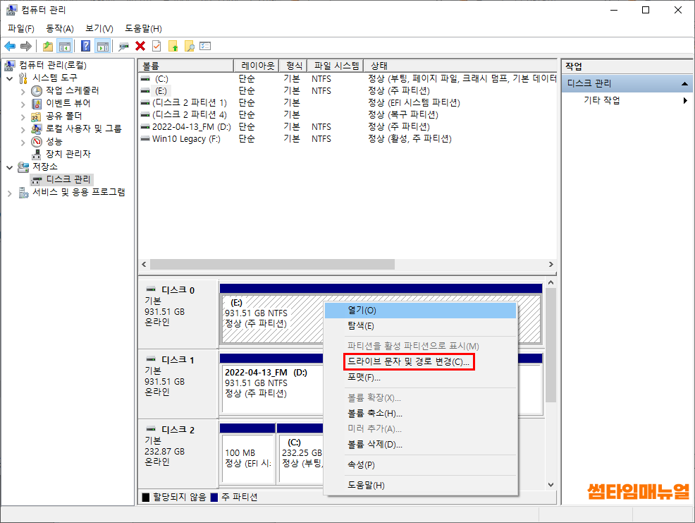 운영체제 내에서의 컴퓨터 관리 항목은 여러가지의 스케줄러나, 이벤트와 성능 등의 여러가지의 시스템 관련한 정보를 확인하거나 제어가 가능한데 가장 많이 사용되는 이유는 아마도 디스크 관리용도로 많이 사용될 것 입니다 디스크를 새롭게 메인보드에 물렸거나, 기존의 디스크를 사용하고자 할때 파티션을 파티션을 제거하는 등의 관리화면으로 디스크를 일시적으로 안보임 처리하고자 하는경우 특정 프로그램이 있지않더라도 간편하게 숨김처리할 수 있는 방법에 대해 소개합니다