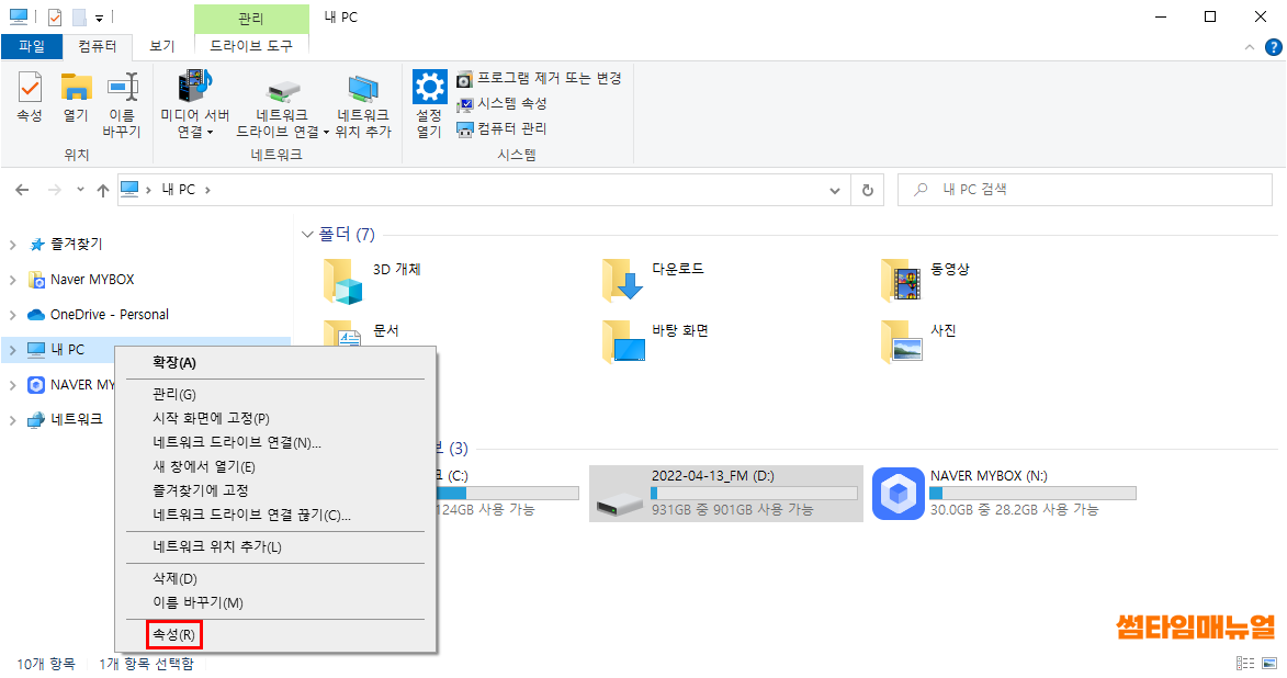 탐색기를 열어 "내 PC" 항목에 우클릭 버튼을 누른 뒤 "관리(G)" 으로 이동합니다