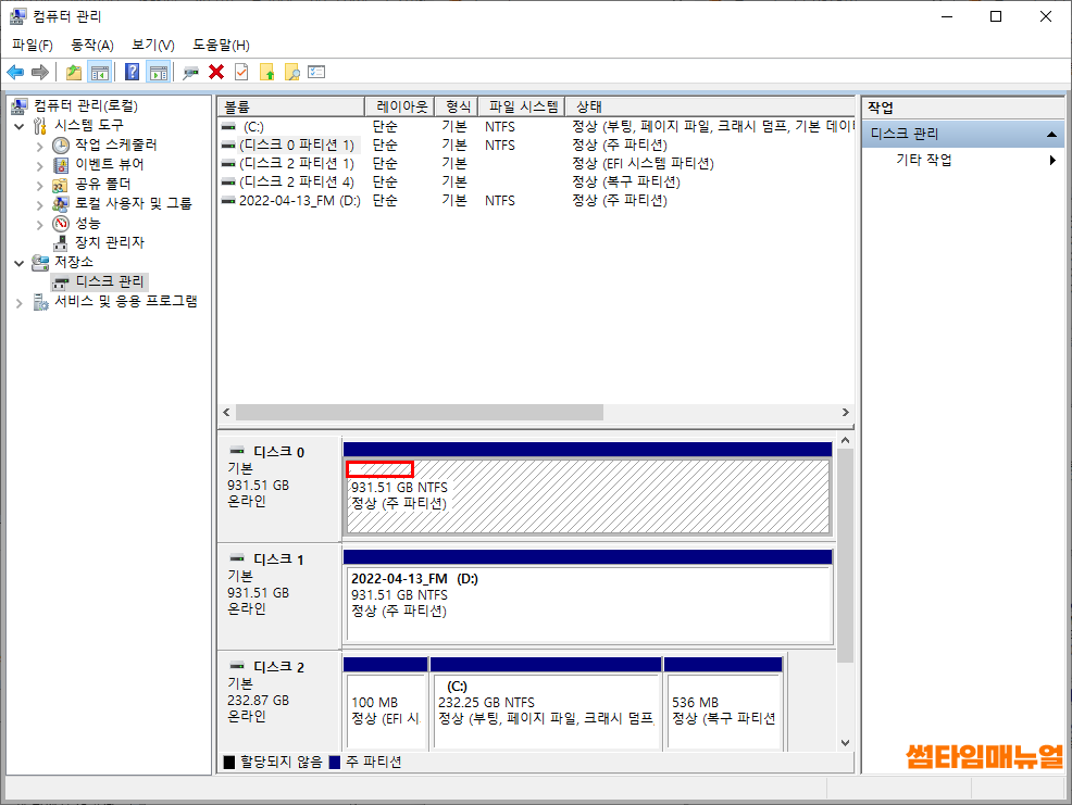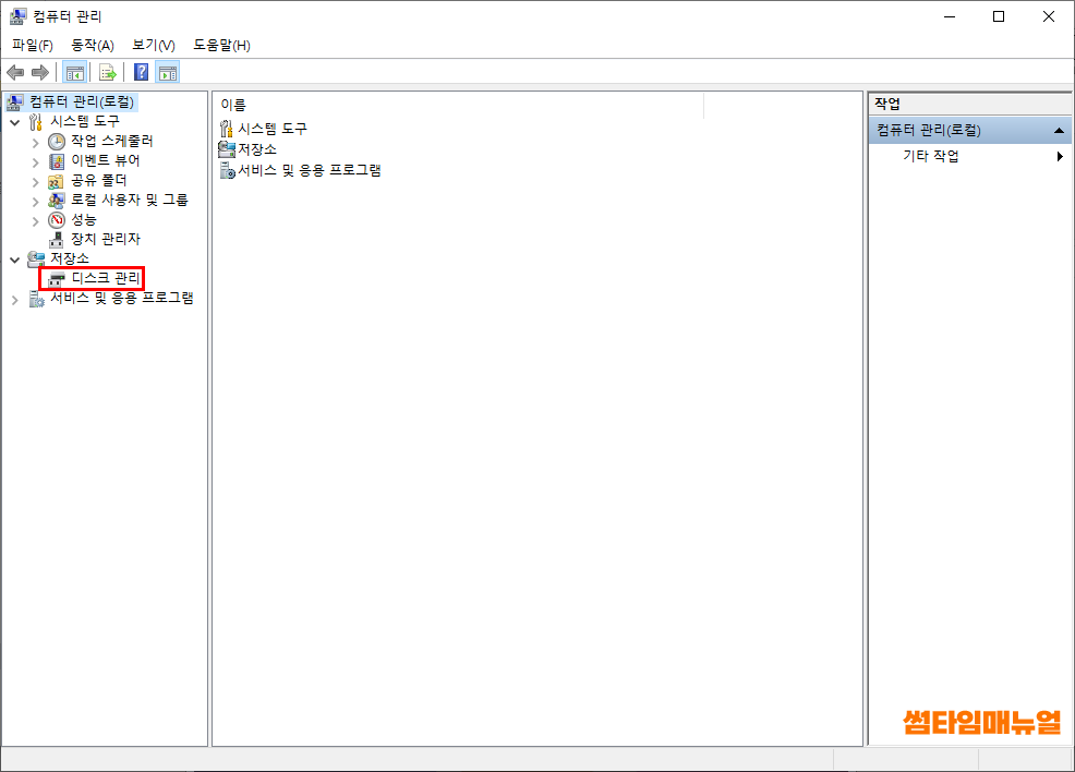 컴퓨터 관리 창에서 좌측의 "저장소" > "디스크 관리" 항목을 클릭하여 선택합니다