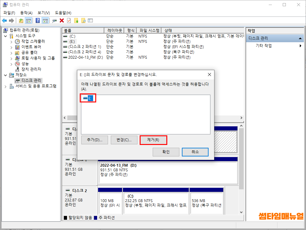 탐색기에서 살펴본다면 방금 제거한 E 드라이브 문자열은 제거되었기 때문에 확인이 불가능하며 필요에 따라 다시 경로지정을 설정하여 사용할 수 있습니다.