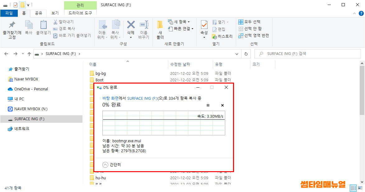 USB 저장장치에 이동시키는 모습으로 폴더내의 자료를 모두 이동시켜줍니다