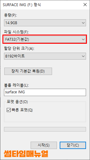 이동식 디스크인 USB의 포맷이 필요한데 파일 시스템인 파티션은 FAT32 로 설정하도록 하며 포맷을 진행해주도록 합니다