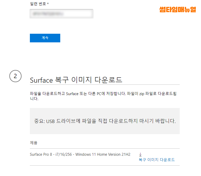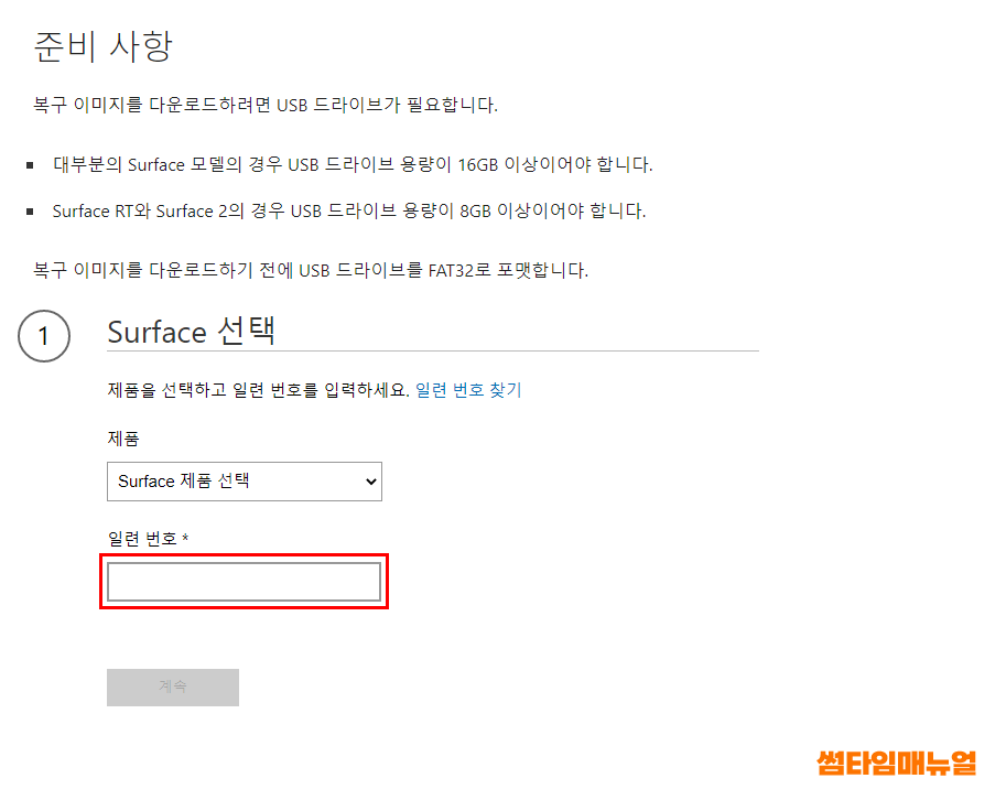 링크로 이동한다면 위의 Surface 모델에 대해서 선택하거나, 모델을 잘 모르는 경우 일련번호를 입력하는 항목에 일련번호를 입력하여 자신의 모델을 찾을 수 있습니다