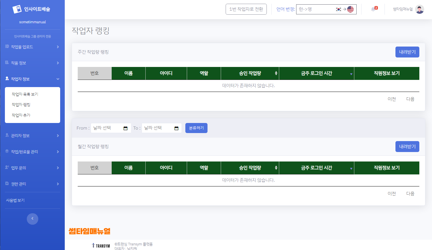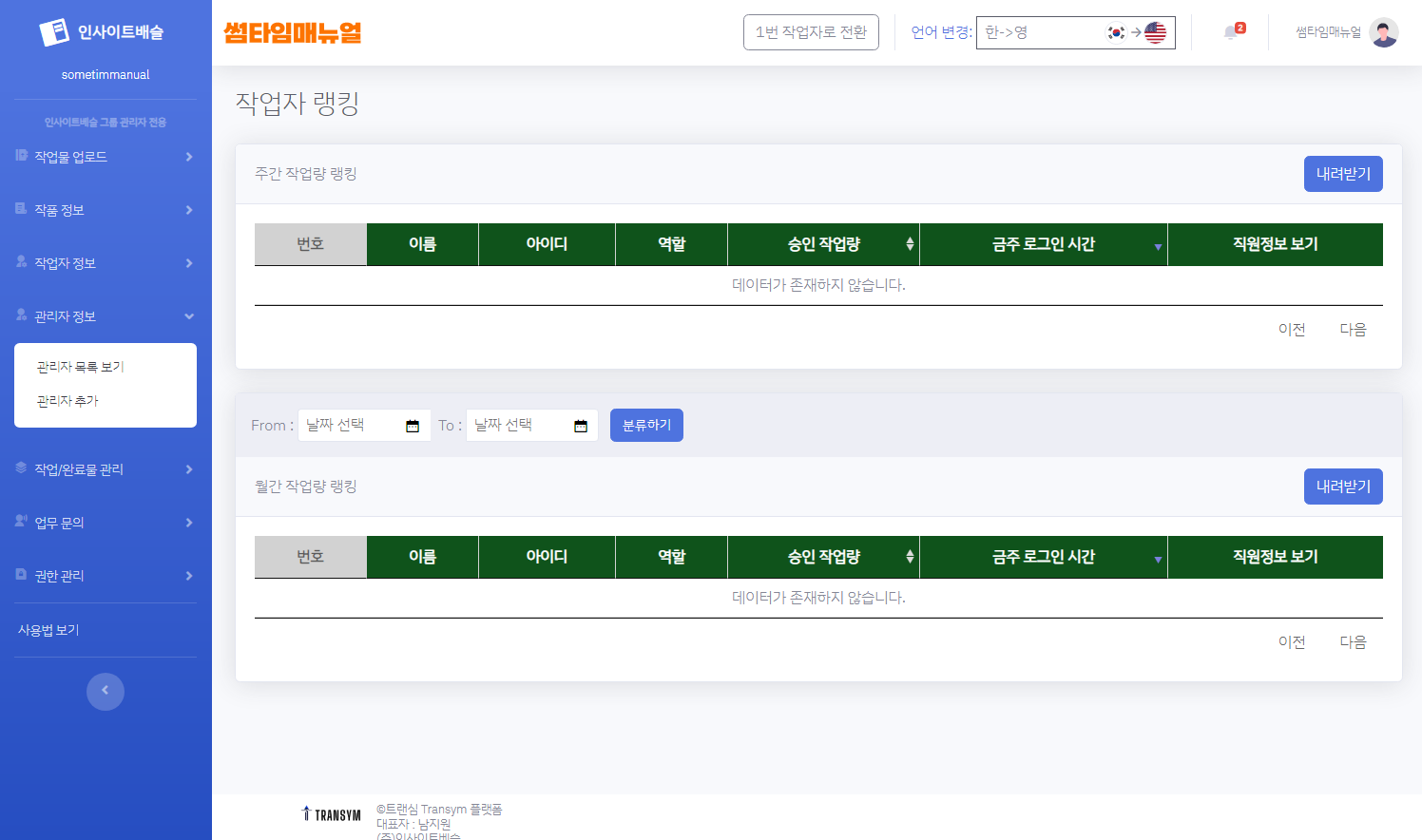 랭킹은 주간, 월간으로 구분되어 현재 작업된 이력들이 확인되며 주로 작업자는 사내에서 번역을 담당하는 작업자들을 지칭할 수 있겠으며 근태관리를 위해 로그인시간이나, 얼마만큼의 작업이 진행되었는지에 대해서도 확인할 수 있습니다