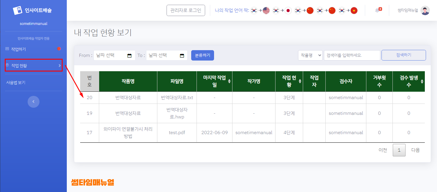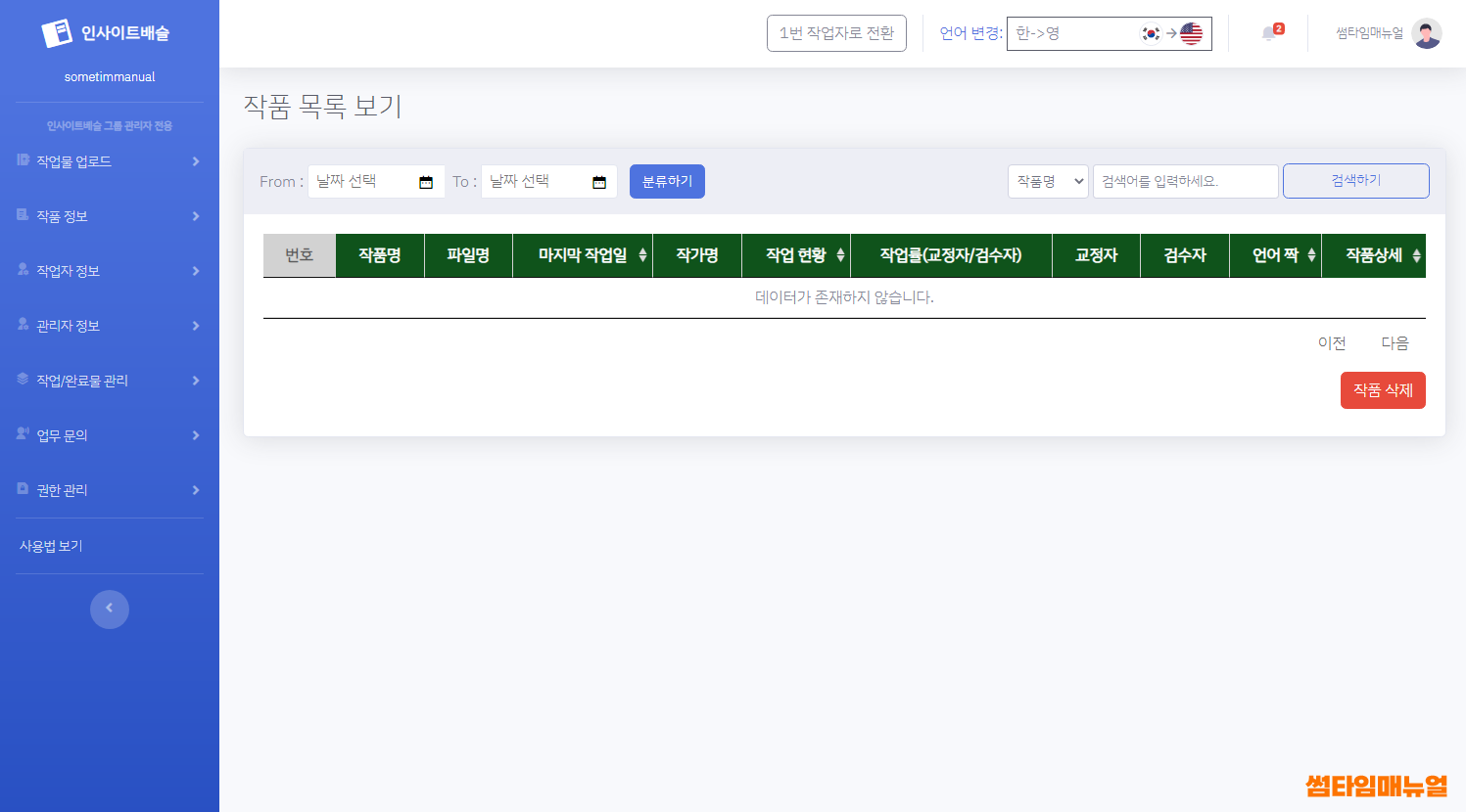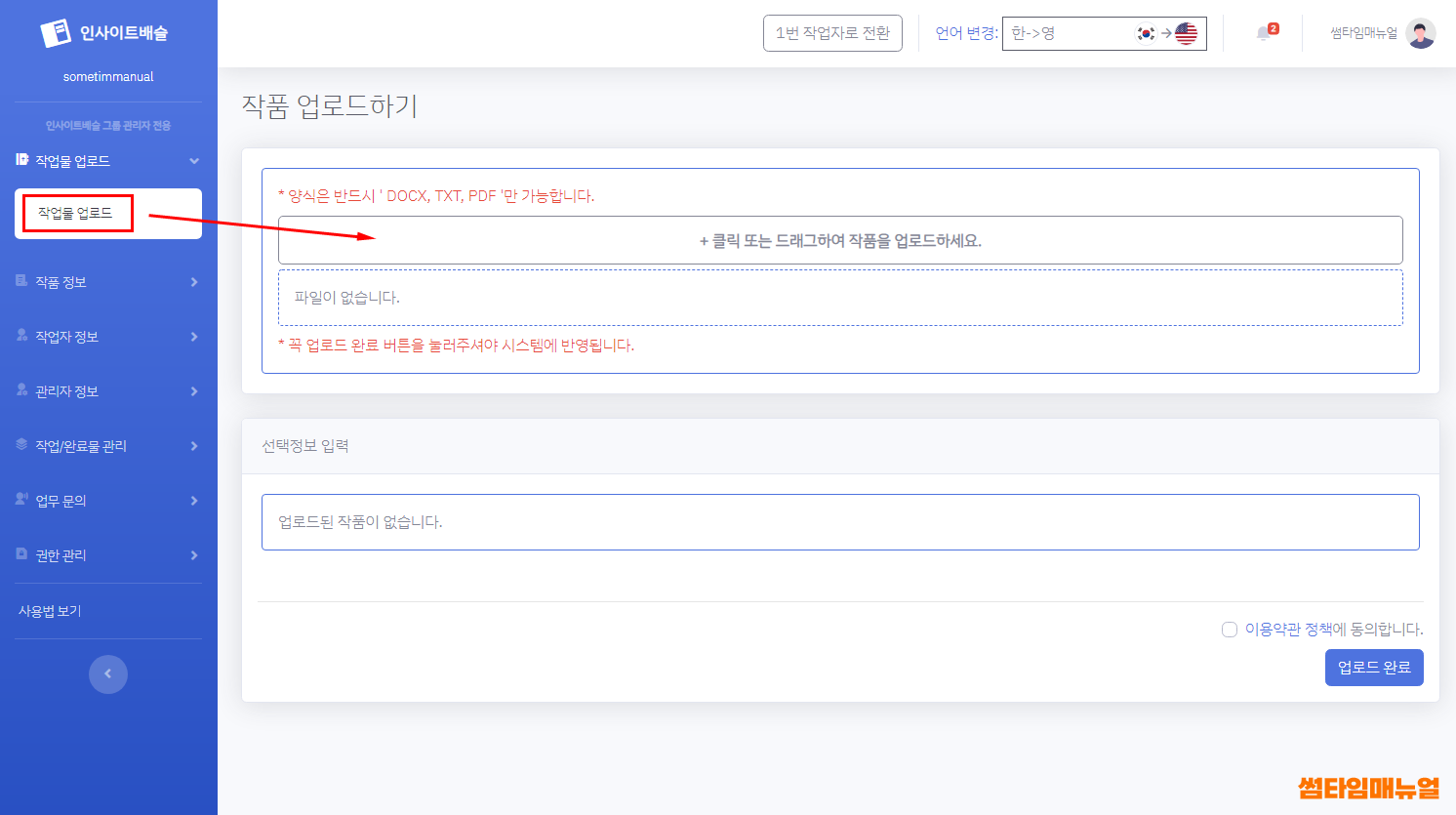 관리자 계정의 로그인시 위와같이 확인되며 관리자의 경우 번역이 필요한 자료를 업로드 해주어야 하므로 좌측 가장 상단에 위치하고 있는 "작업물 업로드" 항목으로 이동합니다