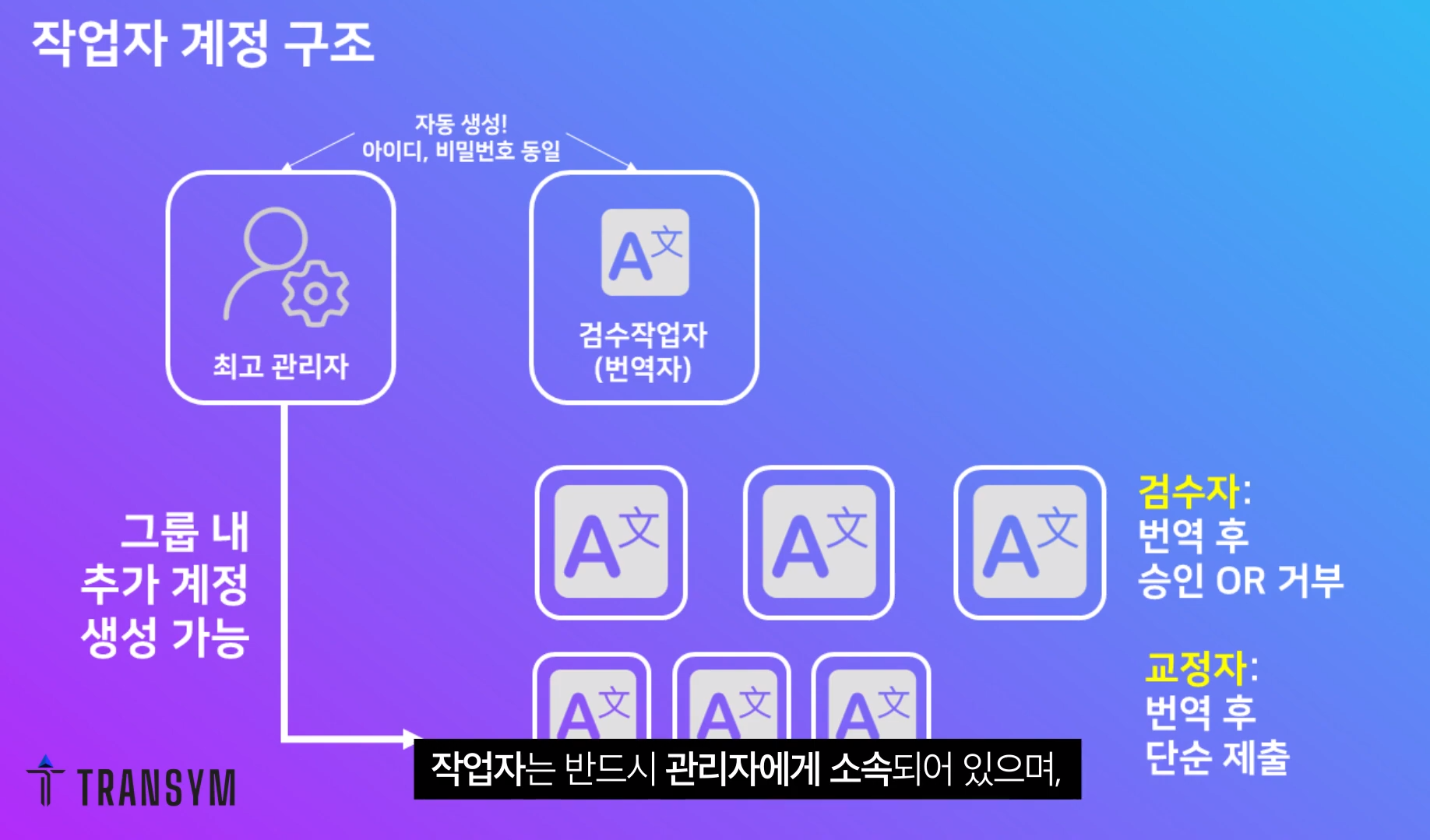 사용방법은 회원가입시 최고 관리자와 검수작업자 계정이 각각 부여되며 관리자와 작업자는 필요에 따라 얼마든지 계정을 만들어 낼 수 있으며 작업자 경우 검수를 하는 검수자와, 교정을하는 교정자의 두가지로 구분됩니다