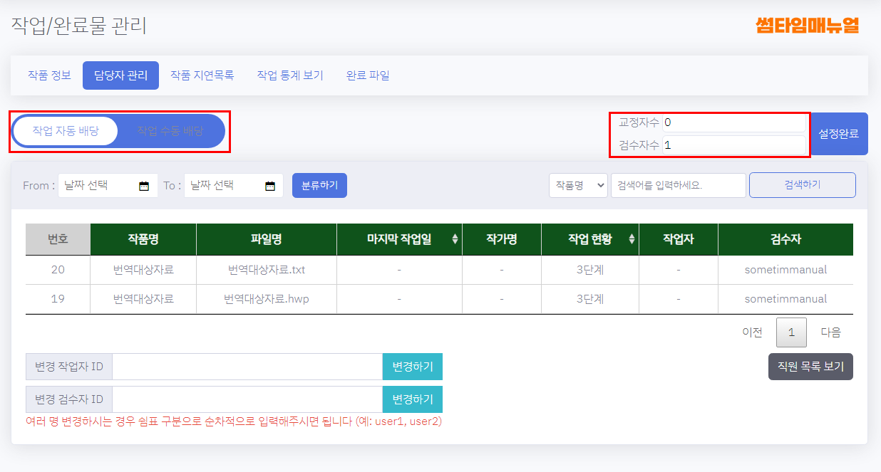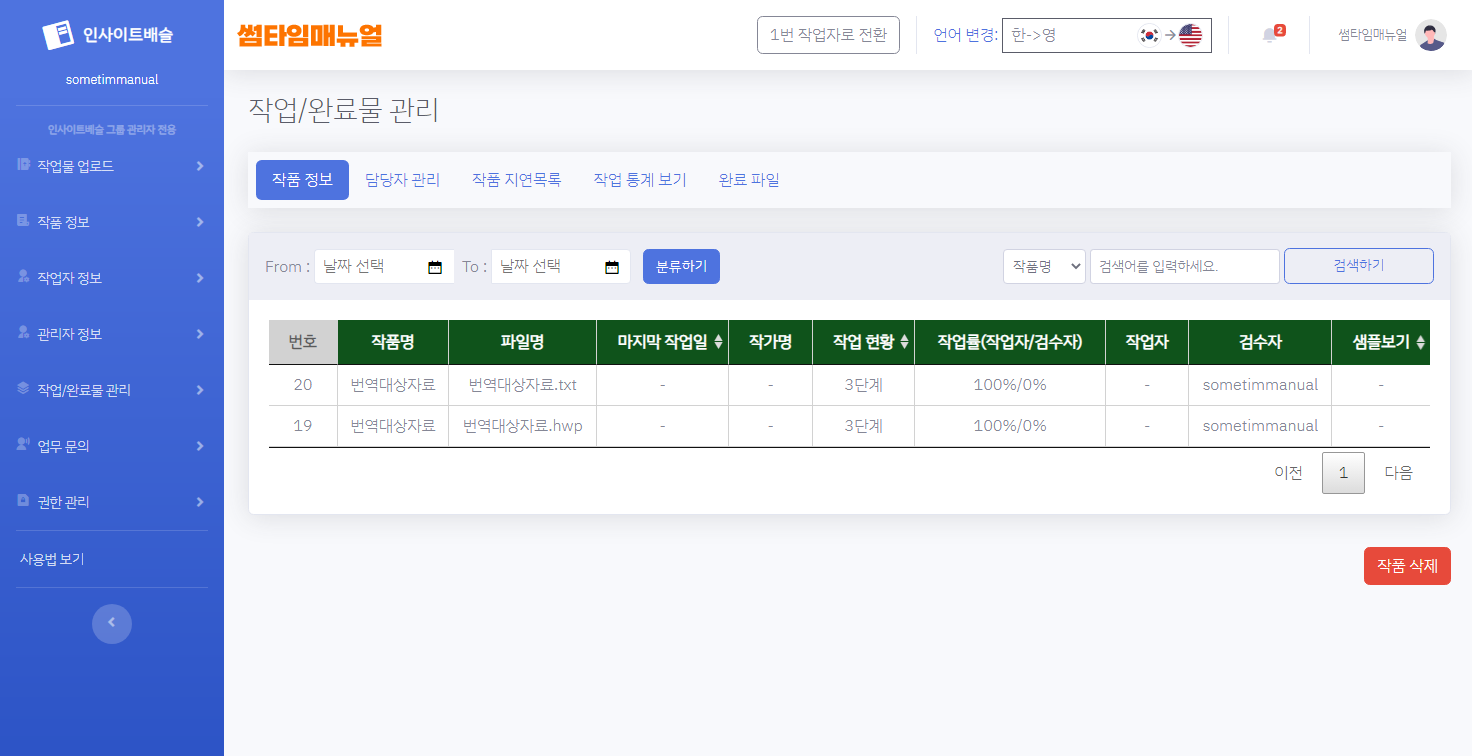 작업/완료물 관리 메뉴로 이동한다면 현재 업로드되어있는 작품정보나 담당자를 배정하거나, 작업전반적인 통계내용 등을 확인할 수 있습니다