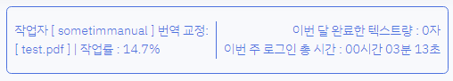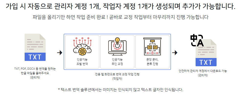 특히나 장점이라고 생각이 드는부분은 PDF 파일의 경우 PDF 라이터를 이용하지않고 꼭 텍스트 만을 추출해낼 필요 없이 간단하게 업로드만으로도 텍스트가 추출되는것이 굉장한 편리한점이라고 생각되었으며 특히 팀단위 작업시 관리자와 작업자를 구분하여 계정별로 업무를 분리할 수 있는 기능이 있고 또한 작업자의 경우 검수자와, 실제 작업자가 각각 구분되어 총 4단계 구분으로 전문번역이 필요한 자료를 관리자가 업로드하면 인공지능이 초벌번역 진행하여 작업자가 틀린 부분을 수정하고 마지막 검수자가 검수하는 시스템으로 잘 구성된듯 보여집니다