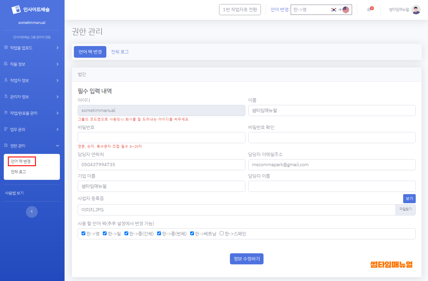 최초 회원가입시에 사용할 언어에 대해 체크가 잘못되어있다면 권한관리 메뉴에서 "언어 짝 변경" 항목을 선택한 뒤 하단의 언어 팩 설정에서 희망하는 언어를 선택하여 수정할 수 있습니다