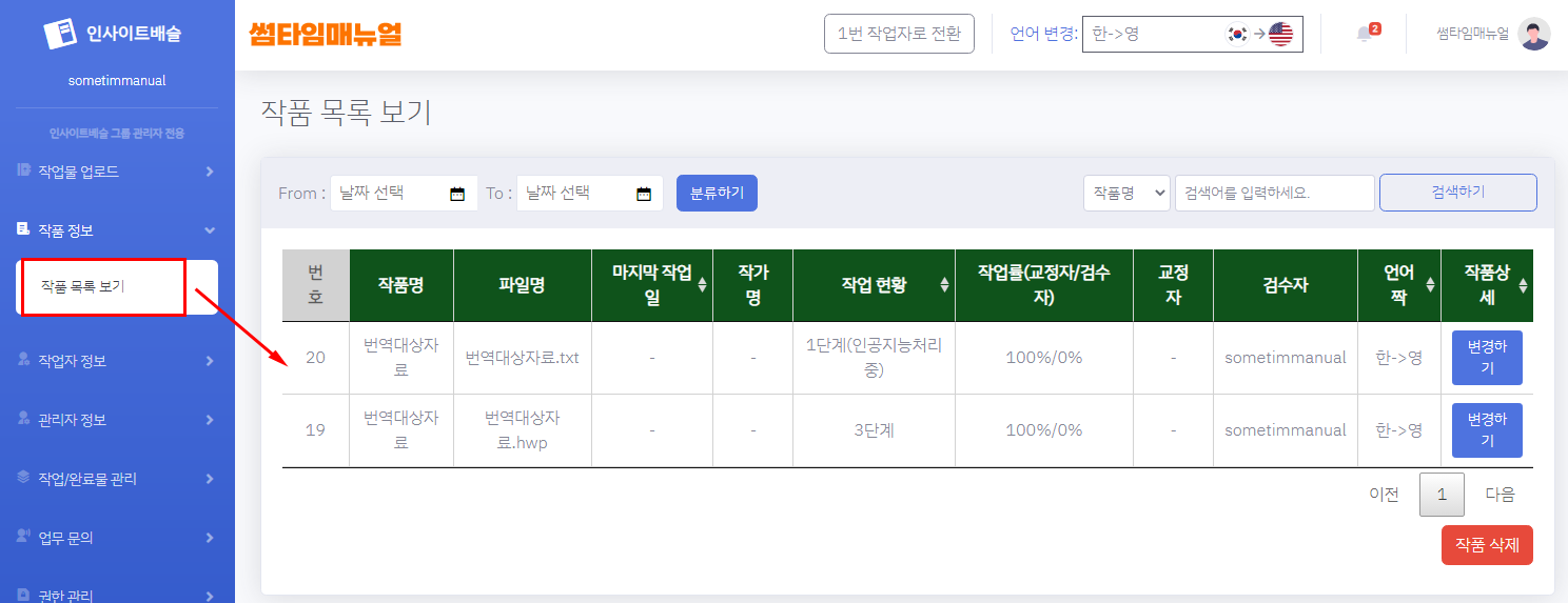 업로드한 파일은 좌측 두번째 메뉴인 작품 목록 보기 메뉴에서 확인할 수 있으며 작품 업로드와 함께 인공지능에서 초벌번역이 진행됩니다 이때 인공지능에서 처리된 작업현황 확인이 가능하며 현재 작업자의 작업현황을 한눈에 확인할 수 있습니다