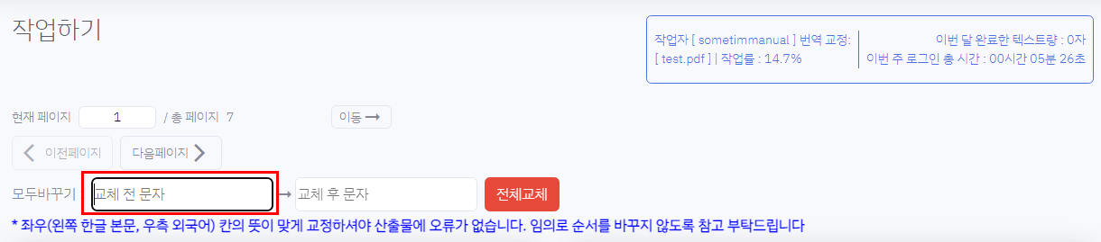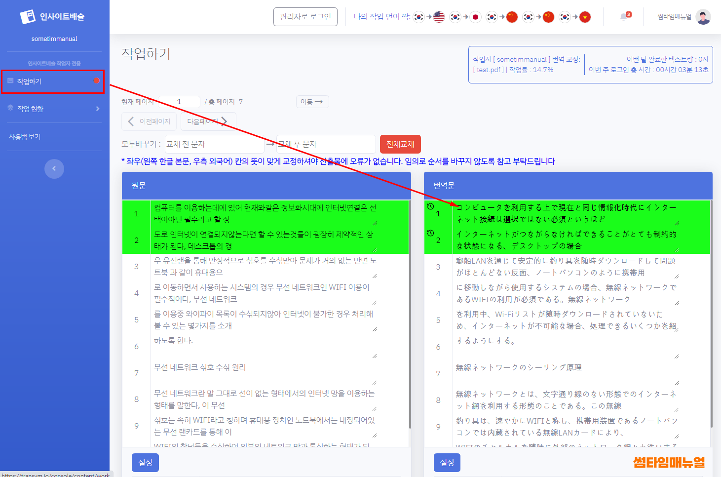 작업자의 경우 좌측의 작업하기 메뉴에서 작업할 내용에 대해 확인이 가능하며 좌측은 업로드한 파일에 우측은 인공지능에서 초벌번역으로 이뤄진 데이터가 확인됩니다 이때 작업자가 번역을 진행시 변경된 항목에 대해서는 초록색상으로 변경이 되어 표시됩니다