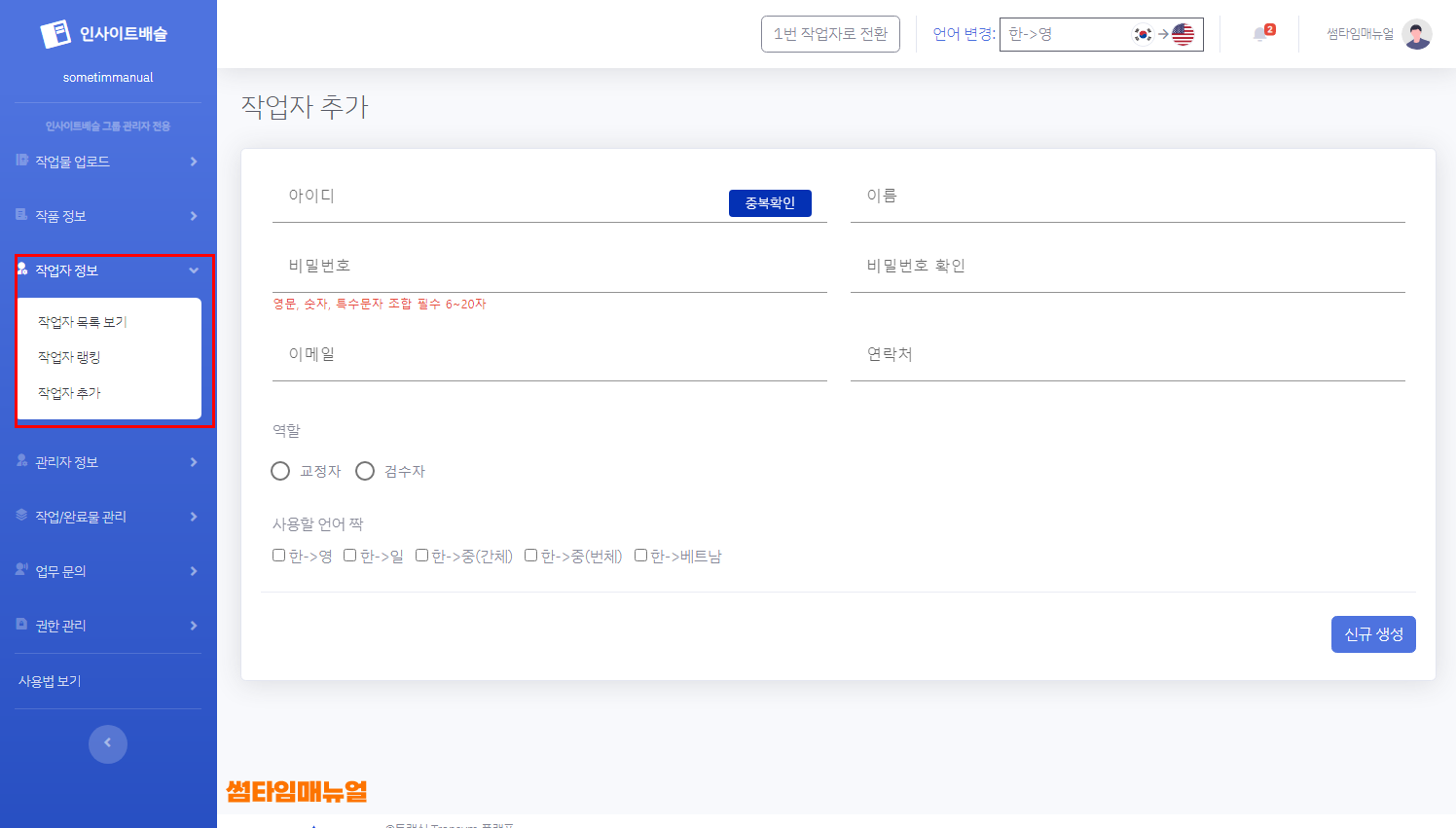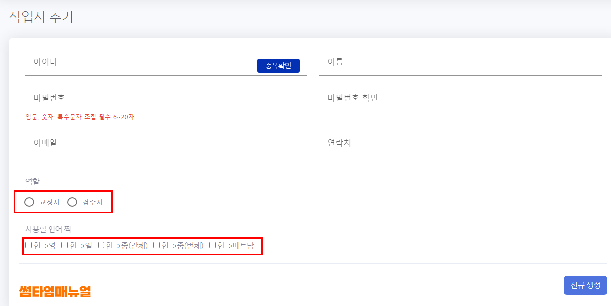 작업자의 추가시 역할들을 선택할 수 있으며 역할은 인공지능에서 번역된 자료를 기반으로 교정하는 교정자가 있고, 이를 검수하는 검수자가 있으므로 각각의 역할에 맞게 선택해주도록 하며 사용할 언어 짝 항목에서 해당 작업자가 작업할 언어를 선택할 수 있어 이를 선택시 작업자는 해당 언어에 맞는 작업물의 확인이 가능합니다