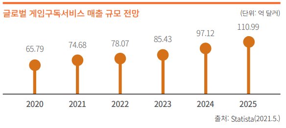 고사양의 피씨와 스마트폰의 보급되며 전세계적으로 게임 수요가 급속도로 가중되어 왔고 전세계적으로 게임 구독 서비스 매출 규모 전망은 위의 이미지와 같이 계속 성장하고 있으며 게임업계에서는 글로벌시장 에서의 수요가 늘어남에 따라 해외 진출이 이제는 선택사항이 아닌 필수적인 전략중에 하나가 되버린 상황입니다