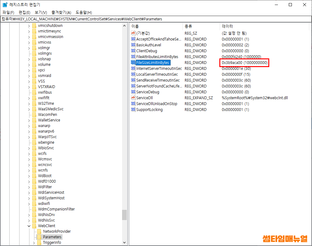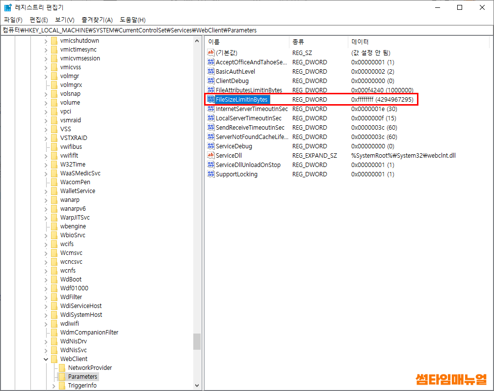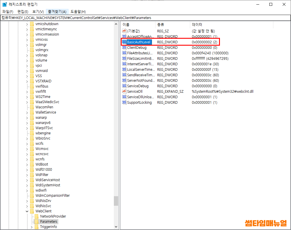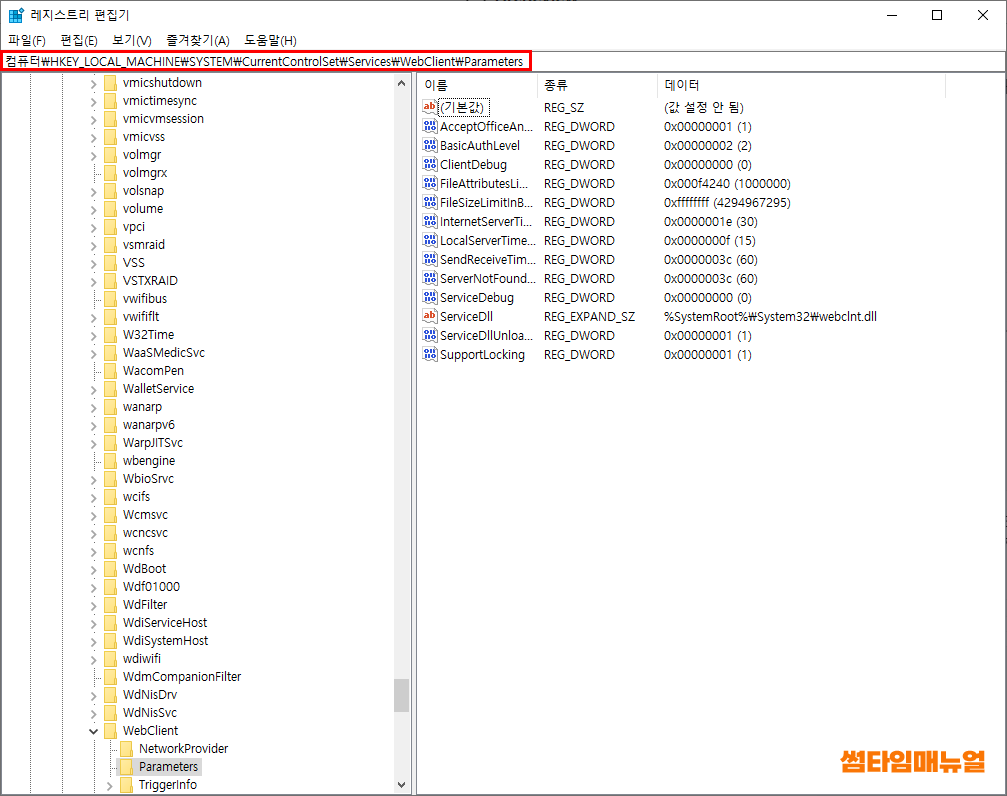 | 컴퓨터\HKEY_LOCAL_MACHINE\SYSTEM\CurrentControlSet\Services\WebClient\Parameters |