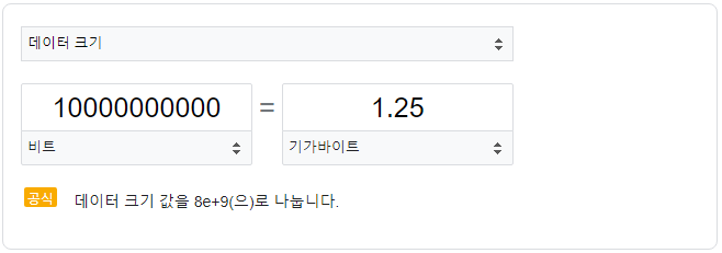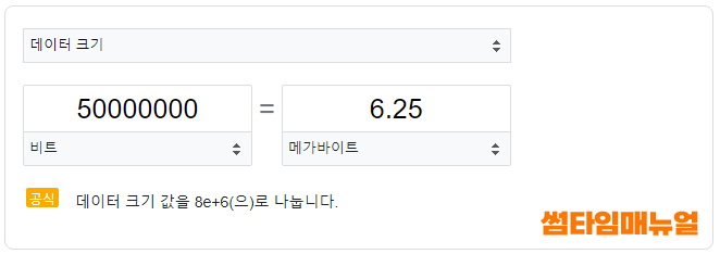 위의 이미지와 같이 50,000,000비트는 6.25MB와 같으며 기가바이트 기준으로 설정하고자 한다면 아래와 같습니다