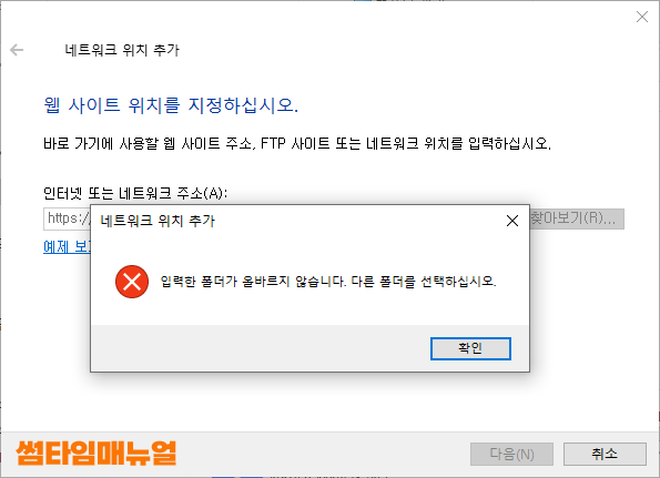 NAS 장치에서 네트워크 드라이브를 통해 폴더의 공유를 설정하고자 하는 경우 Windows7, 8, 8.1, 10, 11 에서는 WebDAV 연결 기본 인증이 https로 기본값으로 설정되어 있어 http 프로토콜을 통한 접속이 불가능합니다 또한 위와같이 "입력한 폴더가 올바르지 않습니다. 다른 폴더를 선택하십시오." 라는 문구가 확인된다면 계정정보를 입력하는 화면에서 계정정보가 틀렸거나, 또는 Windows 에서 설정되어있는 레지스트리 값이 https 만을 허용 으로 설정되어있는 경우에도 발생하게 됩니다