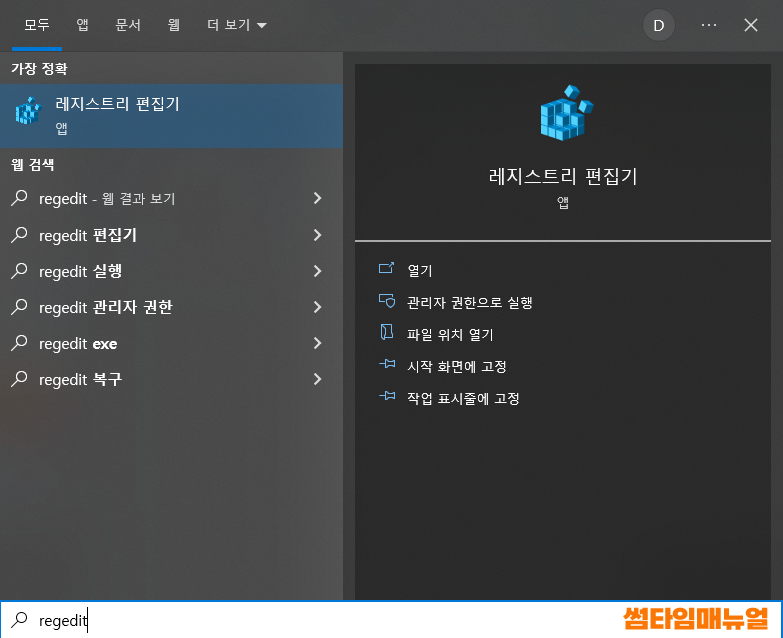 레지스트리 편집기를 실행하기 위해 키보드의 윈도우키 버튼을 누른 뒤 "regedit" 또는 "레지스트리 편집기" 를 입력하여 위와같이 레지스트리 편집기를 실행하여 줍니다