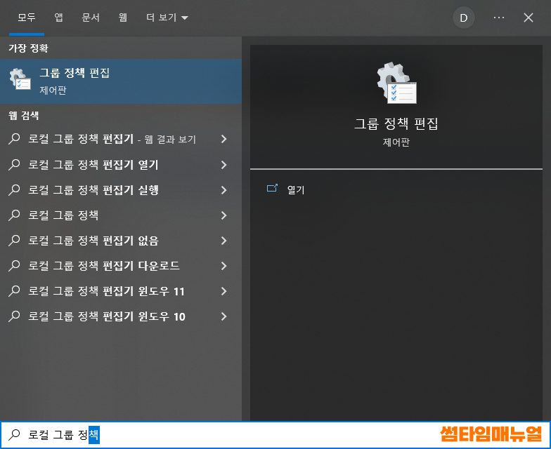 윈도우 키를 눌러 "로컬 그룹 정책 편집기" 또는 "gpedit.msc" 를 입력 하여 그룹 정책 편집 항목을 선택합니다