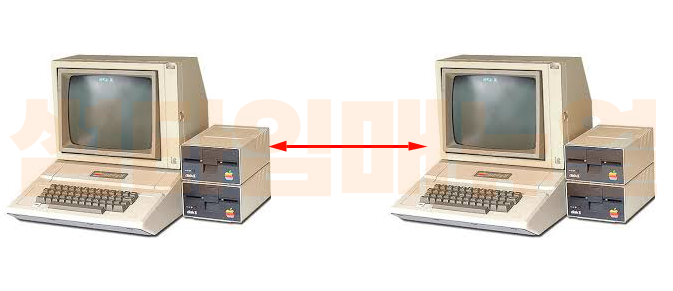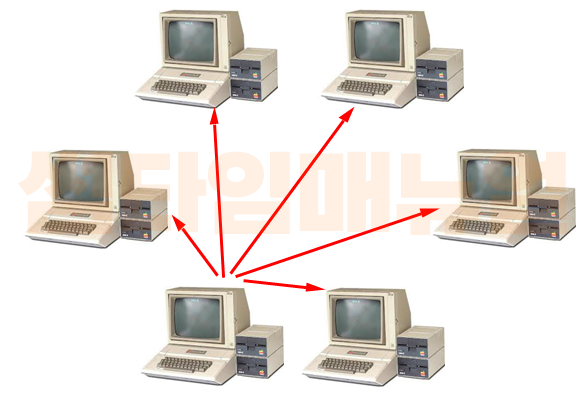 네트워크를 이용하여 시스템간 통신이 이뤄지기 위해서는 최소 2대 시스템이 필요하게 되는데 네트워크 통신은 단 두대의 시스템에서 서로 통신되는 것에 그치지않고 여러대의 데스크톱에서 서로 통신이 이뤄지는것이 일반적으로 따라서 위의 형태에서 댓수가 여러대 늘어난다고 가정한다면 아래와같은 모습을 보여주게 됩니다